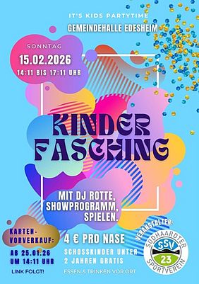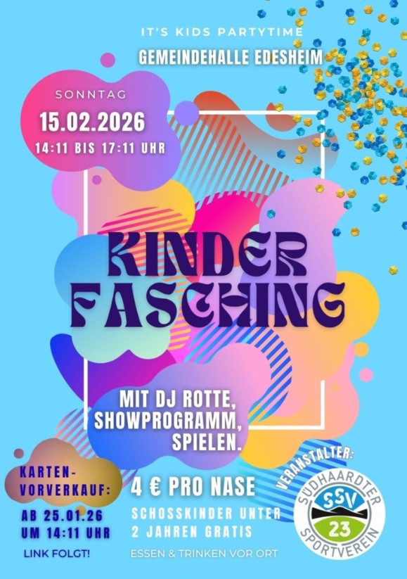 Der Südhaardter Sportverein 2023 e.V. lädt am Faschingssonntag, 15. Februar 2026 von 14:11 Uhr bis 17:11 Uhr die kleinen Jecken zum Kinderfasching in die Gemeindehalle Edesheim ein.